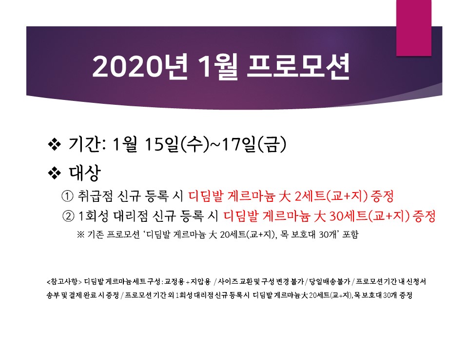 - 프로모션 기간 외 1회성 대리점 신규 등록 시 '디딤발 게르마늄 大 20세트(교정용+지압용) + 목 보호대 30개' 증정